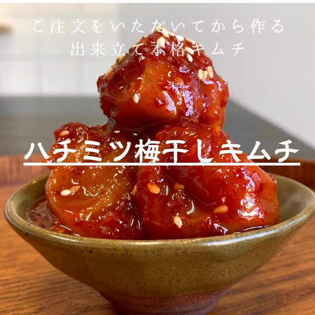 ハチミツ梅干しキムチ 150g 《韓国出身の店主が作る出来立てキムチ》 大粒で柔らかい果肉が特徴の 和歌山県産ハチミツ南高梅と 甘辛いヤンニョムと合わせた創作キムチ。 じゅわっと溢れるハチミツ梅の甘酸っぱい旨みがヤンニョムと溶け合い、他にはない美味しさです。 店舗でもリピーターがとくに多い逸品で 梅干しが得意ではない方にもご好評です。 旨みの溶け合ったヤンニョムにたっぷりつけて、ぜひ白ごはんに合わせてお召し上がりください。 原材料 ハチミツ南高梅、韓国産唐辛子、はちみつ えびの塩辛玉ねぎ、りんご、水飴、魚醤 ニンニク、生姜、梅、もち米、ゴマ、胡麻油、 調味料(アミノ酸) 砂糖、香料、保存料、着色料使用していません 発送方法 クール便 製造月日 袋に明記 保存方法 到着後、 冷蔵庫に保管 賞味期限 製造月日より14日